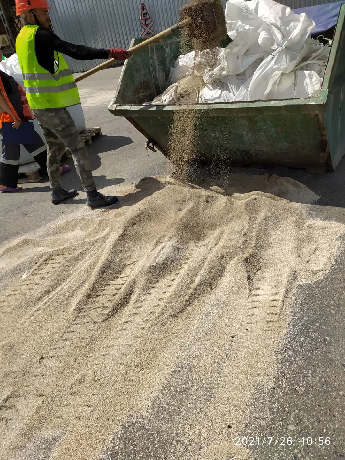 Заказали наших стропальщиков на производство, для выгрузки Биг-Бегов. Работы происходили утром. Ниши работники всегда подготовлены для выполнения таких работ. У нас имеются удостоверения, а так же все работники полностью экипированы для проведения стропальнических работ.  Выгрузку закончили за 2 часа, но из-за плохой укладки товара в вагоне несколько мешков были порваны, так же Заказчик попросил избавиться от негодных остатков в контейнер с помощью лопат.